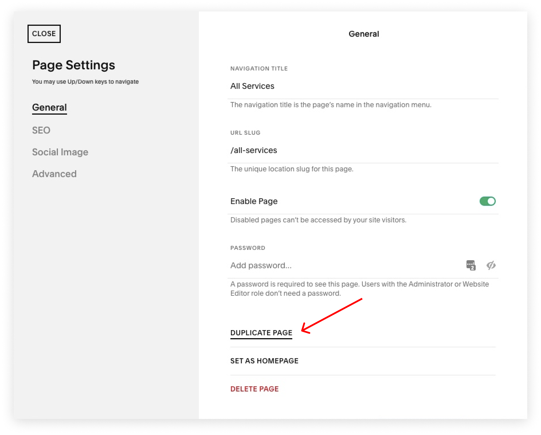 To duplicate a page click a small gear icon next to it. In the general settings scroll down and click Duplicate page. You can put these duplicated pages in the Not-Linked section, so no one sees them except for you. To do this, just click the name of the page and drag it down.